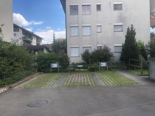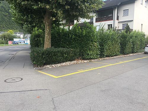 Es stehen zwei mit Praxis angeschriebene Parkplätze zu Verfügung (hinten links und rechts). Die drei auf der linken Seite liegenden Parkplätze dienen ebenfalls als Besucherparkplätze.